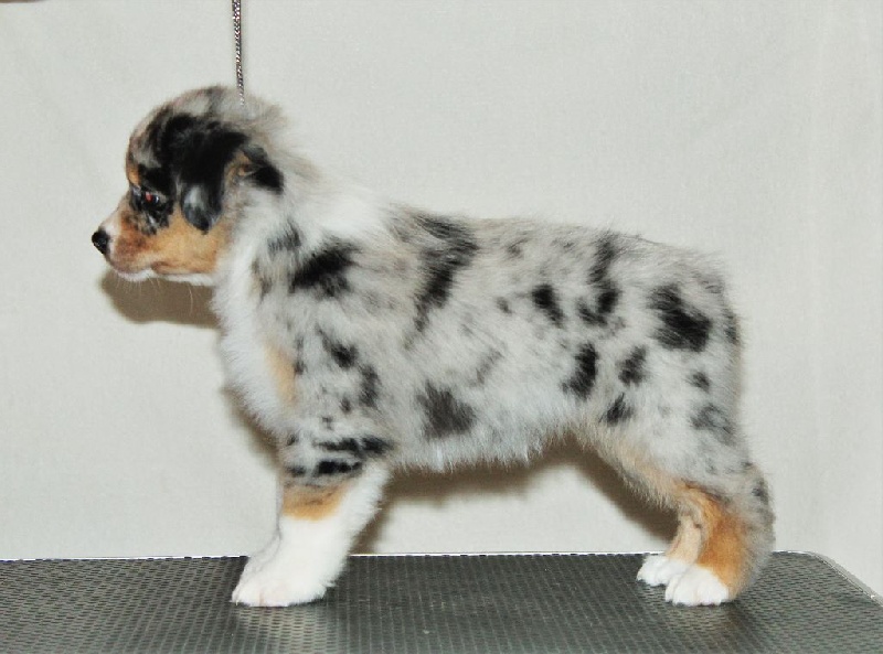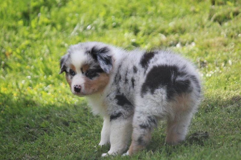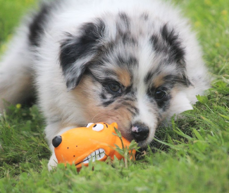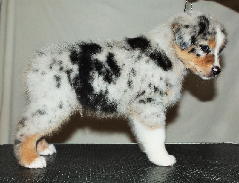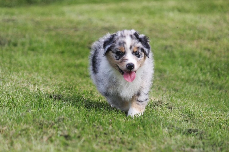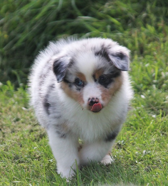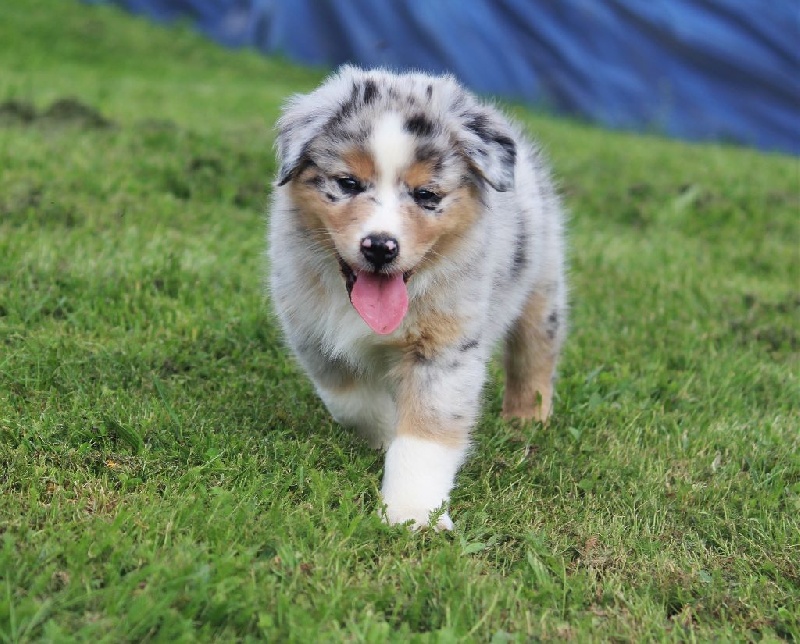 Mâle bleu merle, queue écourtée, le deuxième né de la portée avec un poids de naissance de 320 grammes, queue écourtée. Ce jeune homme sait user de sa parole pour se faire comprendre, c' est aussi un très bon camarade de jeux. C' est un petit chien avec un peu de caractère qui ne se laisse pas faire.