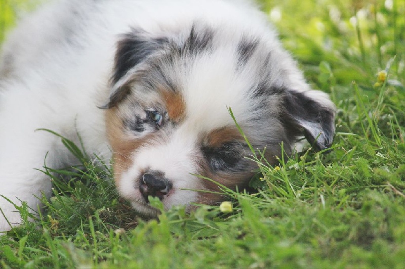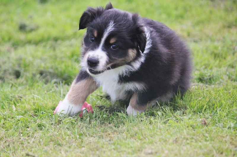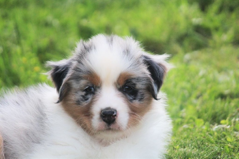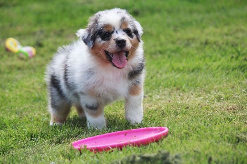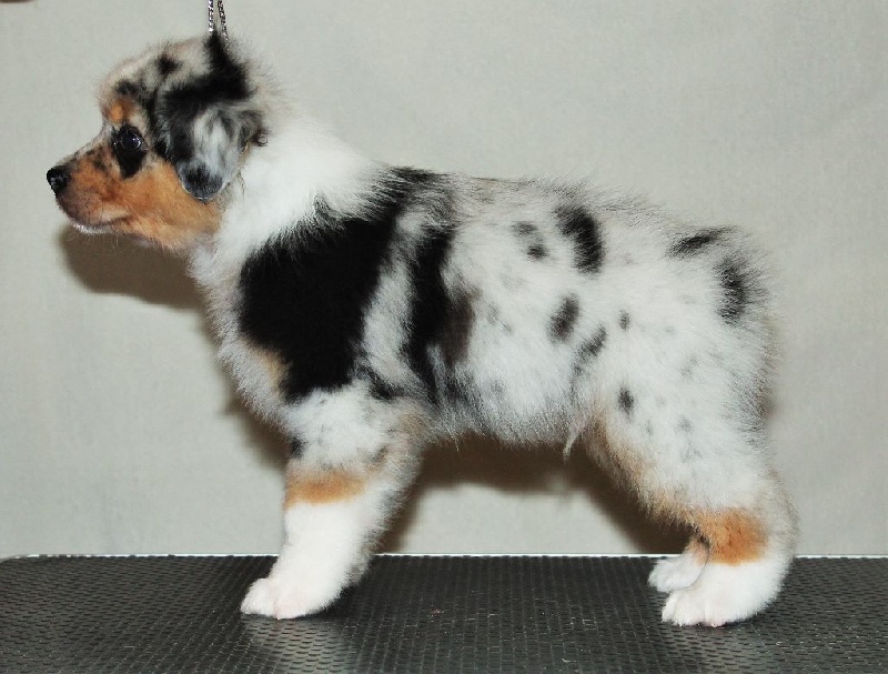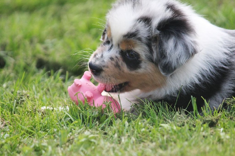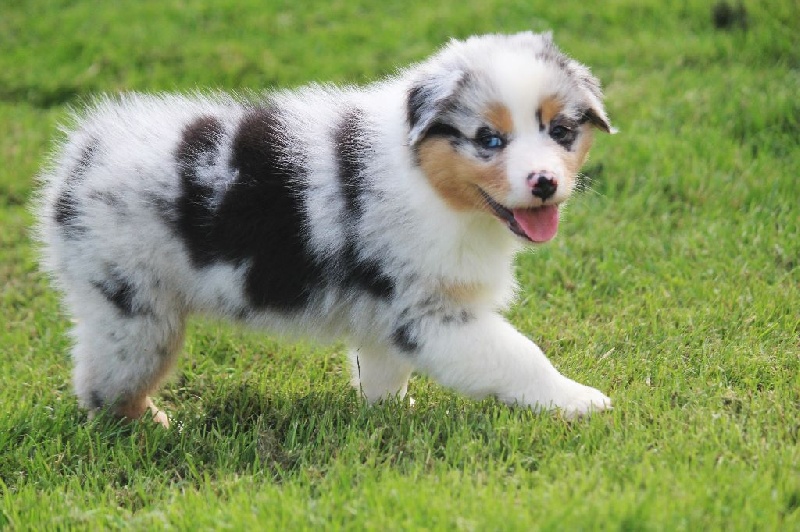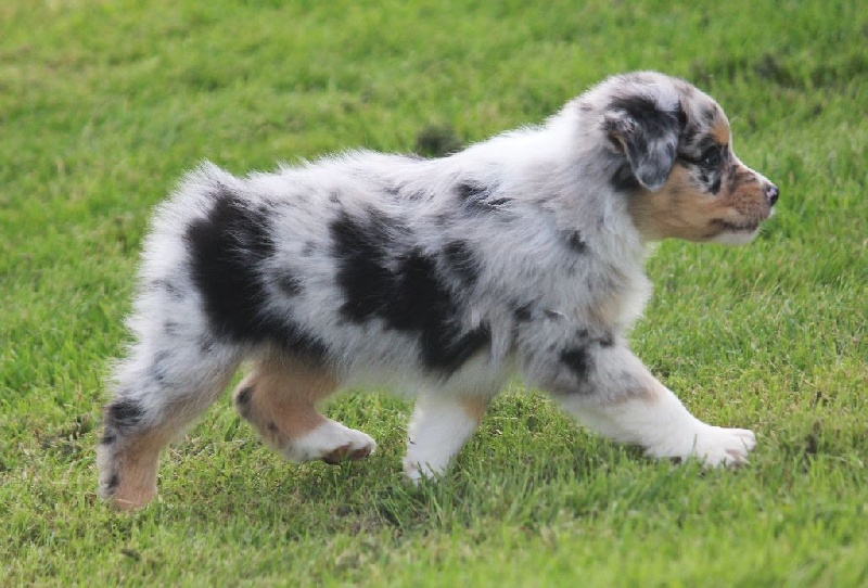 Mâle bleu merle, queue écourtée, le deuxième né de la portée avec un poids de naissance de 320 grammes, queue écourtée. Ce jeune homme sait user de sa parole pour se faire comprendre, c' est aussi un très bon camarade de jeux. C' est un petit chien avec un peu de caractère qui ne se laisse pas faire.