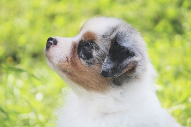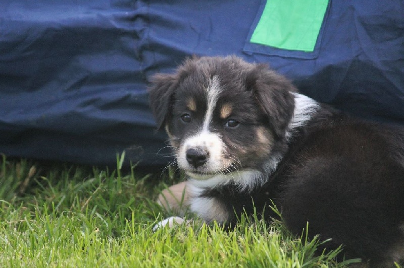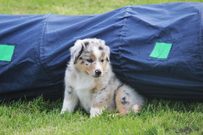 Femelle bleue merle, la cinquième née de la portée avec un poids de naissance de 280 grammes. Cette petite mère est pleine de vie et très énergique déjà! Plutôt indépendante, ceci dit elle sait être câline aussi. Queue écourtée. Moka est partit vivre dans l' Ariège chez Sandrine Pascal et Tiphaine, Elevage de La Plaine Ariégoise, qui à déjà une fille de Fender. Moka vivra avec plusieurs australiens et sortira très régulièrement en expositions avec la petite de la famille.