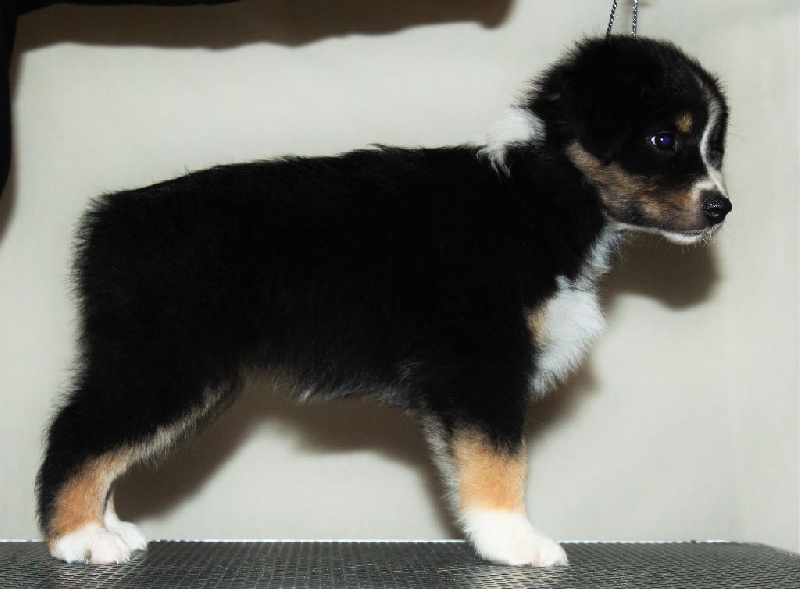Femelle noir tricolore, la quatrième née de la portée avec un poids de naissance de 320 grammes. Cette demoiselle est une exploratrice avec déjà un bon petit caractère, elle gambade très bien, toujours la première pour tout, elle sait ce qu' elle veux et comment l' obtenir. Queue écourtée. Cette demoiselle a été le coup de coeur de cette portée, d' ou la décision de la garder ici avec nous.